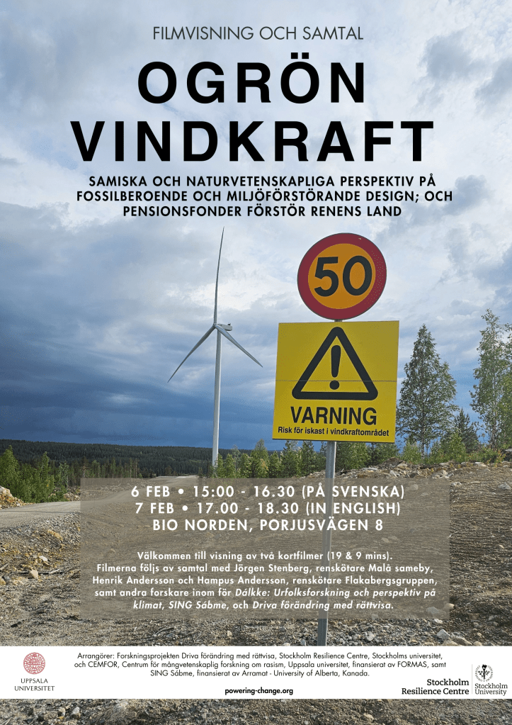 Presentations on research in progress within Powering Change With Justice: Weaving Indigenous perspectives to uncover impacts of the wind energy transition, funded by FORMAS, led by Dr Vanessa Masterson, Stockholm Resilience Centre; โดฐโตโตโดฐโตโดฐโต ฤrramฤt: Strengthening Health And Wellbeing Through Indigenous-Led Conservation and Sustainable Relationships With Biodiversity, based at University of Alberta, Edmonton, and SING Sรกbme: Questioning โGreen Energyโ and its Impact on Indigenous Livelihoods in Sweden, all co-led by Dr May-Britt รhman, Centre for Multidisciplinary Studies on Racism, CEMFOR, Uppsala University