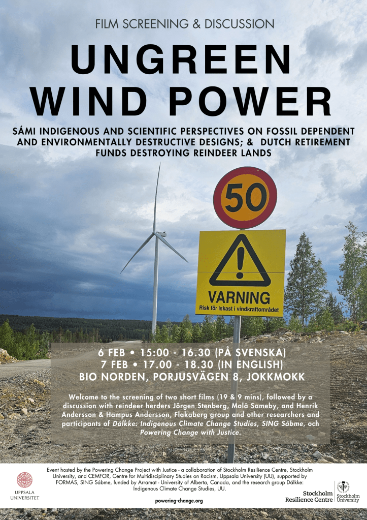 Event hosted by the Powering Change Project with Justice – a collaboration of Stockholm Resilience Centre, Stockholm University, and CEMFOR, Centre for Multidisciplinary Studies on Racism, Uppsala University (UU), supported by FORMAS, SING Sรกbme, funded by Arramat – University of Alberta, Canada, and the research group Dรกlkke: Indigenous Climate Change Studies, UU.